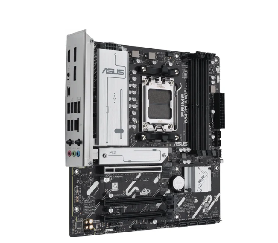 mATX, чипсет AMD B840, память 4xDDR5 до 7600 МГц, слоты: 3xPCIe x16 4.0, 3xM.2, 802.11ax (Wi-Fi 6E)+Bluetooth 5.3, 8+2+1 фаз питания