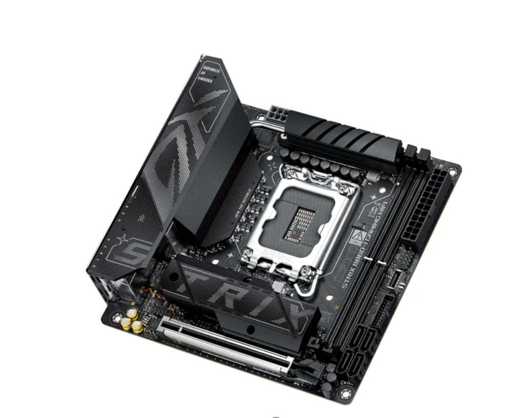 miniITX, чипсет Intel B860, память 2xDDR5/DDR5 CUDIMM до 9066 МГц, слоты: 1xPCIe x16 5.0, 2xM.2, 802.11be (Wi-Fi 7)+Bluetooth 5.4, 10+1+2+1 фаз питания