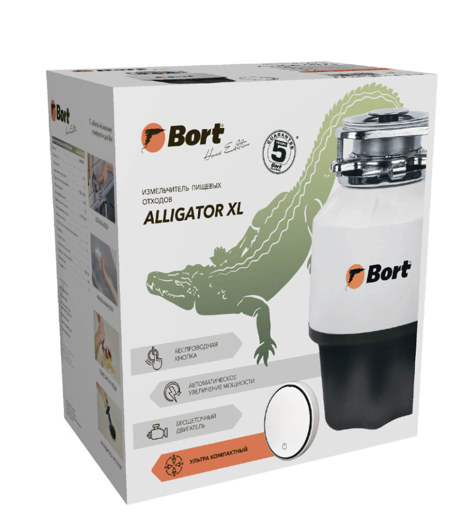 Измельчитель пищевых отходов Bort Alligator X 93414707 — уникальная модель с компактным BLDC мотором. Высота измельчителя составляет всего 22 см, что делает возможным размещение системы фильтрации, мусорного ведра и чистящих средств в одном шкафчике с измельчителем. Bort Alligator X быстро и бесшумно справится с переработкой остатков еды от очистков овощей и фруктов до куриных и рыбных костей и мяса, и избавит вас от неприятных запахов из мусорного ведра. Модель подходит для моек с диаметром сливного отверстия 90 см, с толщиной дна от 1 до 18 мм. Измельчительная камера объемом 1.6 л выполнена из нержавеющей стали, без ножей и шнеков, что гарантирует абсолютную безопасность устройства. Сливная труба оснащена входом для дополнительной раковины и входом для перелива.