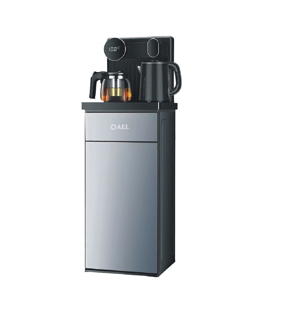 Кулер с чайным столиком Тиабар LK-AEL-81a cool grey напольный, цвет: серый, функции: нагрев 1350 Вт, со шкафчиком для посуды, нижняя загрузка воды