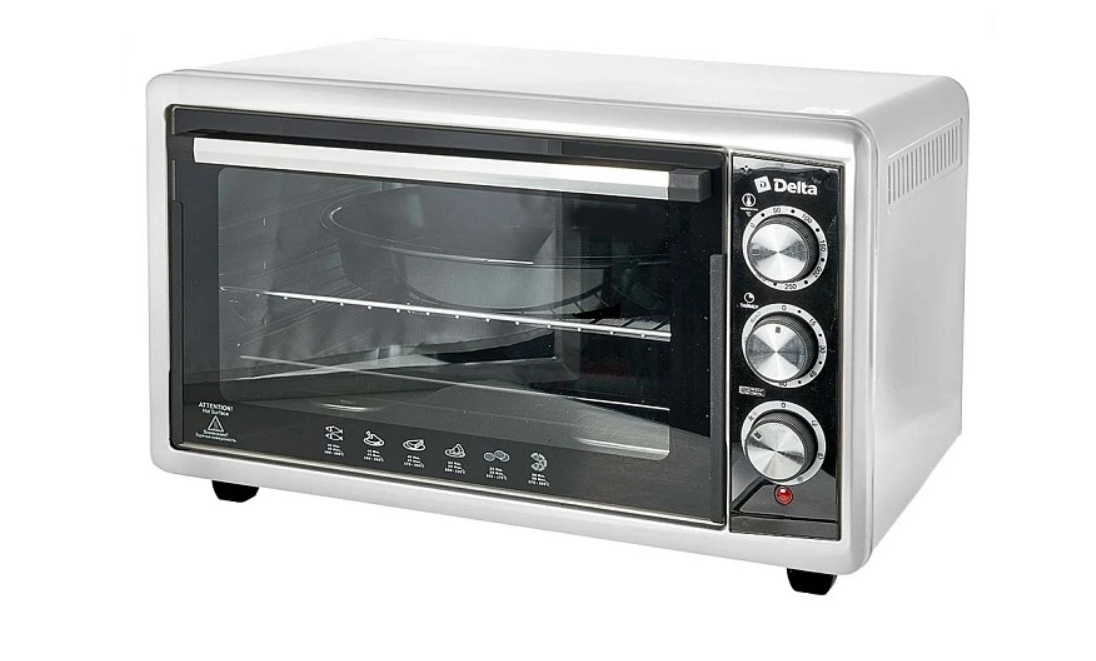 Мини-печь DELTA D-533 выполнена в корпусе белого цвета. Она имеет духовой шкаф объемом 55 л. В модели реализованы 6 режимов приготовления. С помощью поворотных переключателей программируются температура в диапазоне 50-320 °С и время запекания до 90 минут
