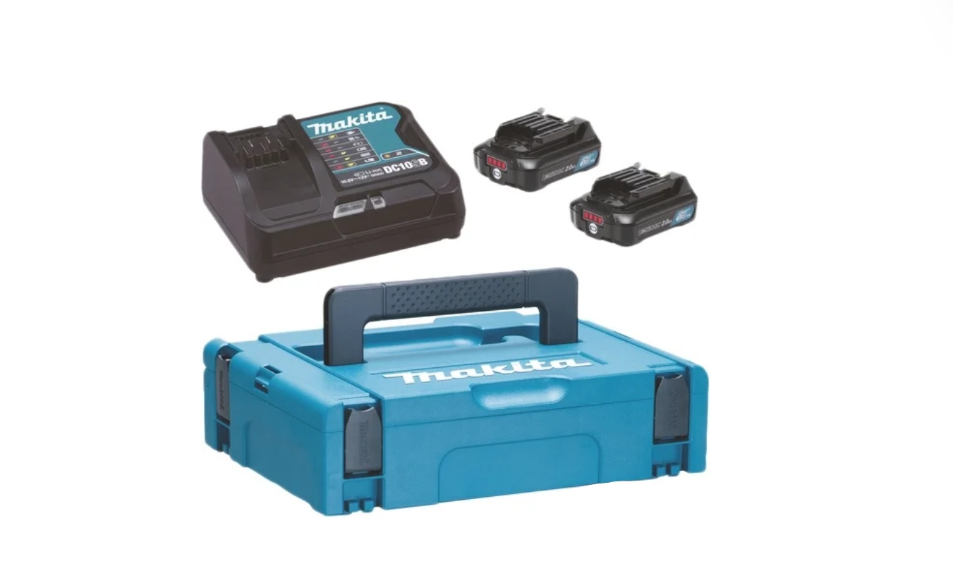 Li-ion, для строительного инструмента, совместим с Makita, 12 В, 2 А·ч, с индикатором заряда, 2 аккумулятора в наборе, напряжение зарядного устройства: 12 В