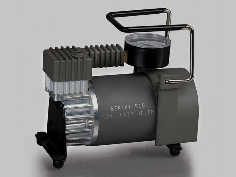 Беркут R15 популярный компрессор за счет небольших габаритов и мощного электродвигателя. Подключение через гнездо прикуривателя автомобиля.