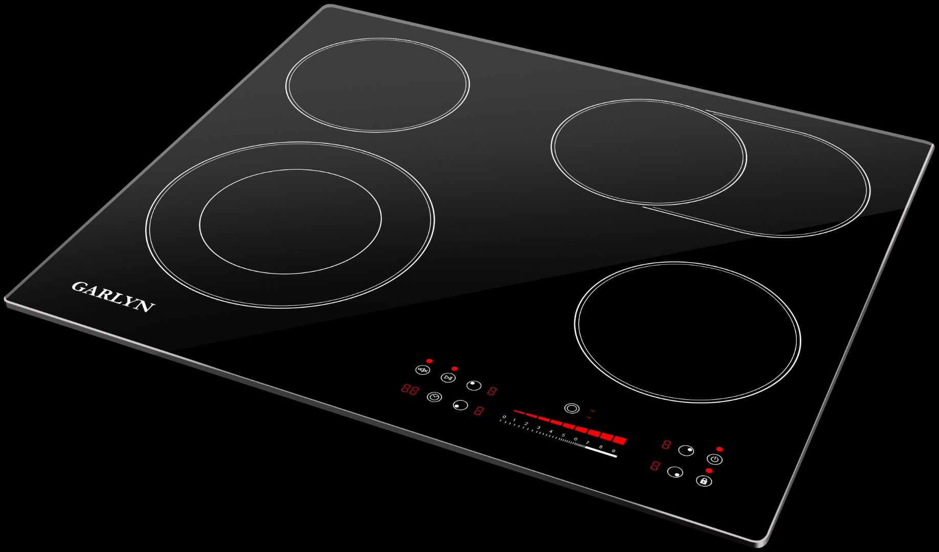 защитное отключение конфорок, индикатор остаточного тепла, кнопка блокировки панели