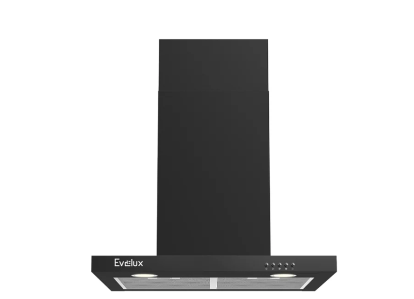 конструкция Т-образная, монтаж настенный, ширина 60 см, управление механическое/кнопочное, производительность мотора 750 м³/ч, цвет черный